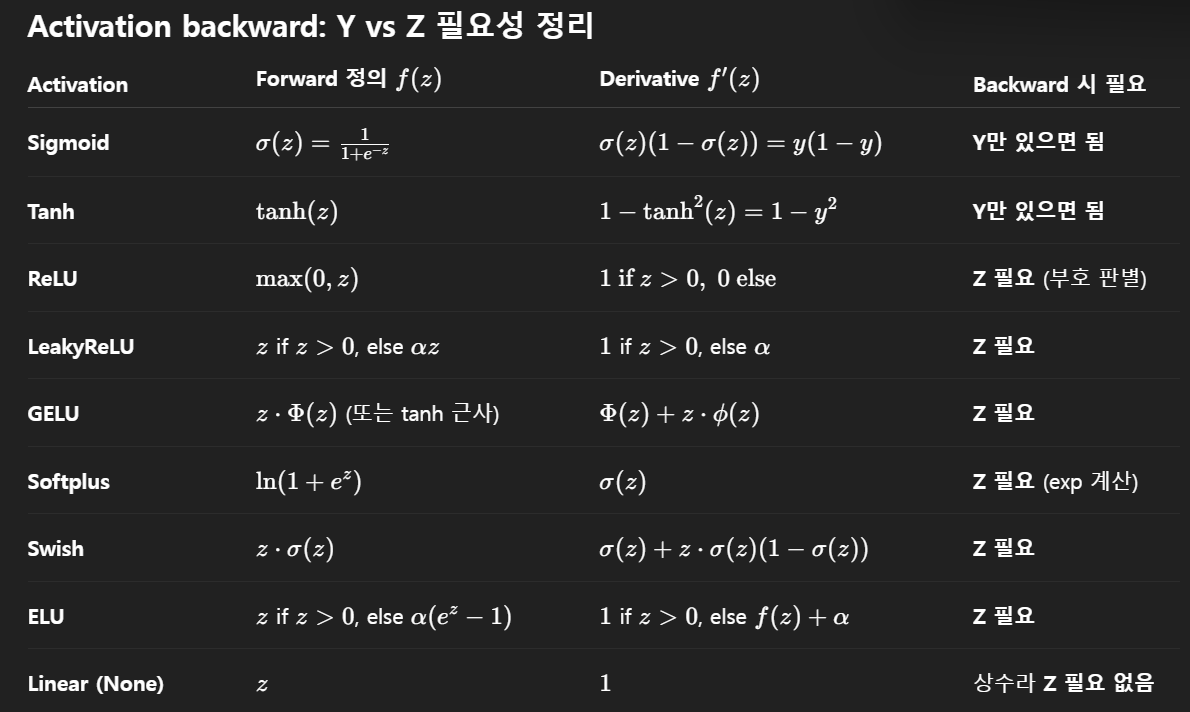 그런데 backward 의 경우 Y 값에서 시작하여 거꾸로, activation - bias - weight 의 연산 과정을 수행하게 되면, 그 activation 의 종류에 따라 Z 값이 필요한 경우가 존재