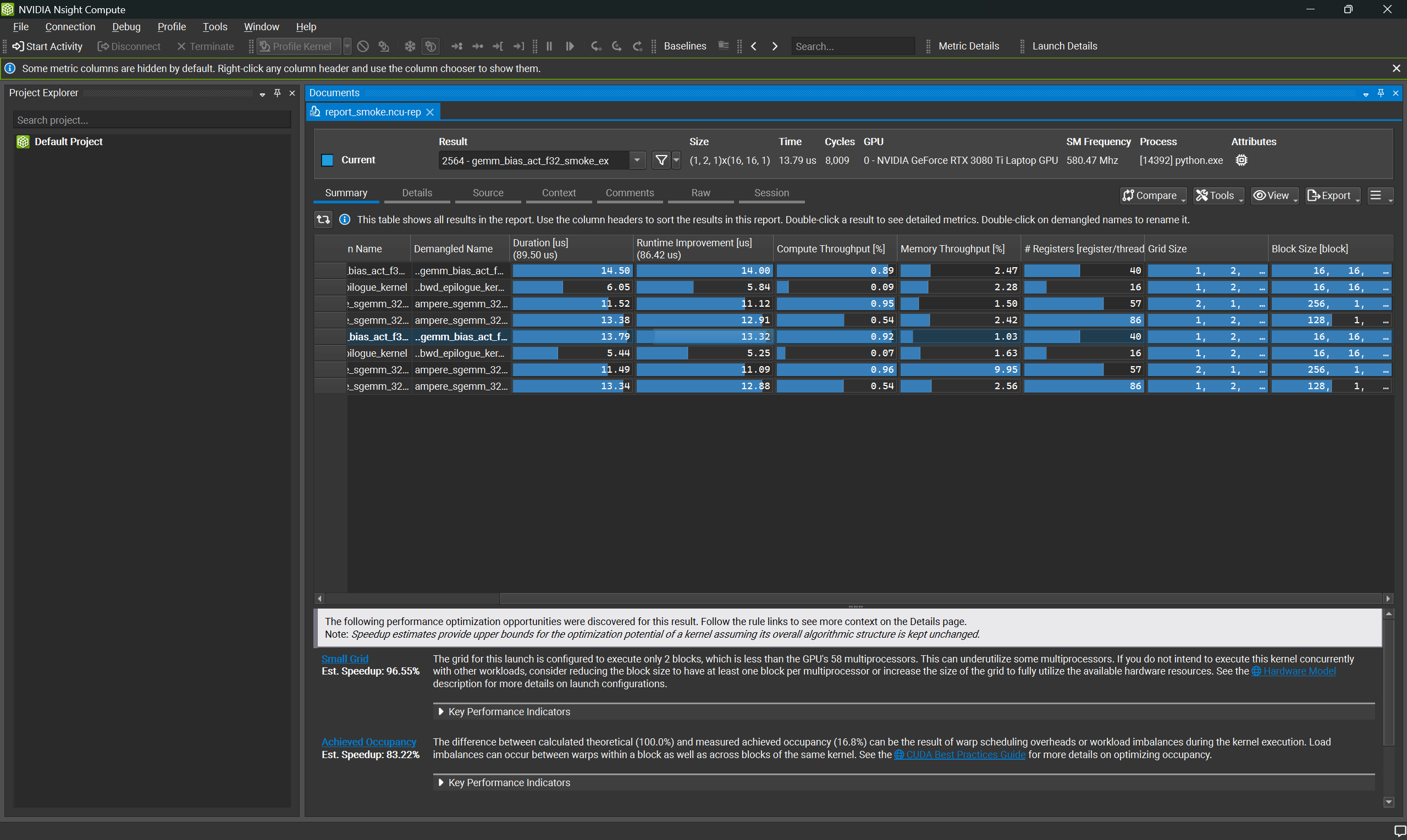 이후 Nsight Compute GUI 를 실행하여 확인할 수 있다. ( 동시에 CLI 에서 확인하는 방법도 존재 )
